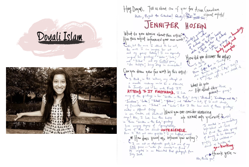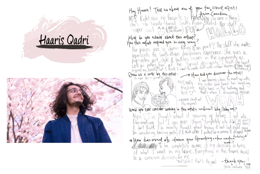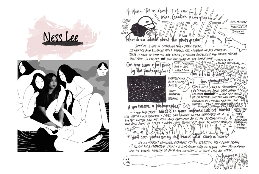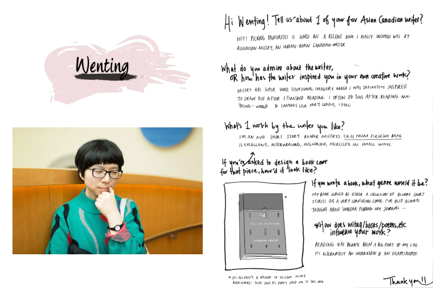Each month, I invited two Asian. Canadian creators to talk about their artistic process, and introduce us to their “favourite” Asian. Canadian creator who engages in a different artistic medium. For the latter, who they are asked to choose was intentional—if the month featured a musician and a writer, I would ask the musician to choose their “favourite” writer, and the writer, their “favourite” musician. I wanted to emphasize the ongoing exchange happening in the creative community. This portion was in a handwritten format, inspired by The Selby’s Q&A, which I adored during my fashion-obsession days. I had the pleasure of featuring 10 diverse group of artists.