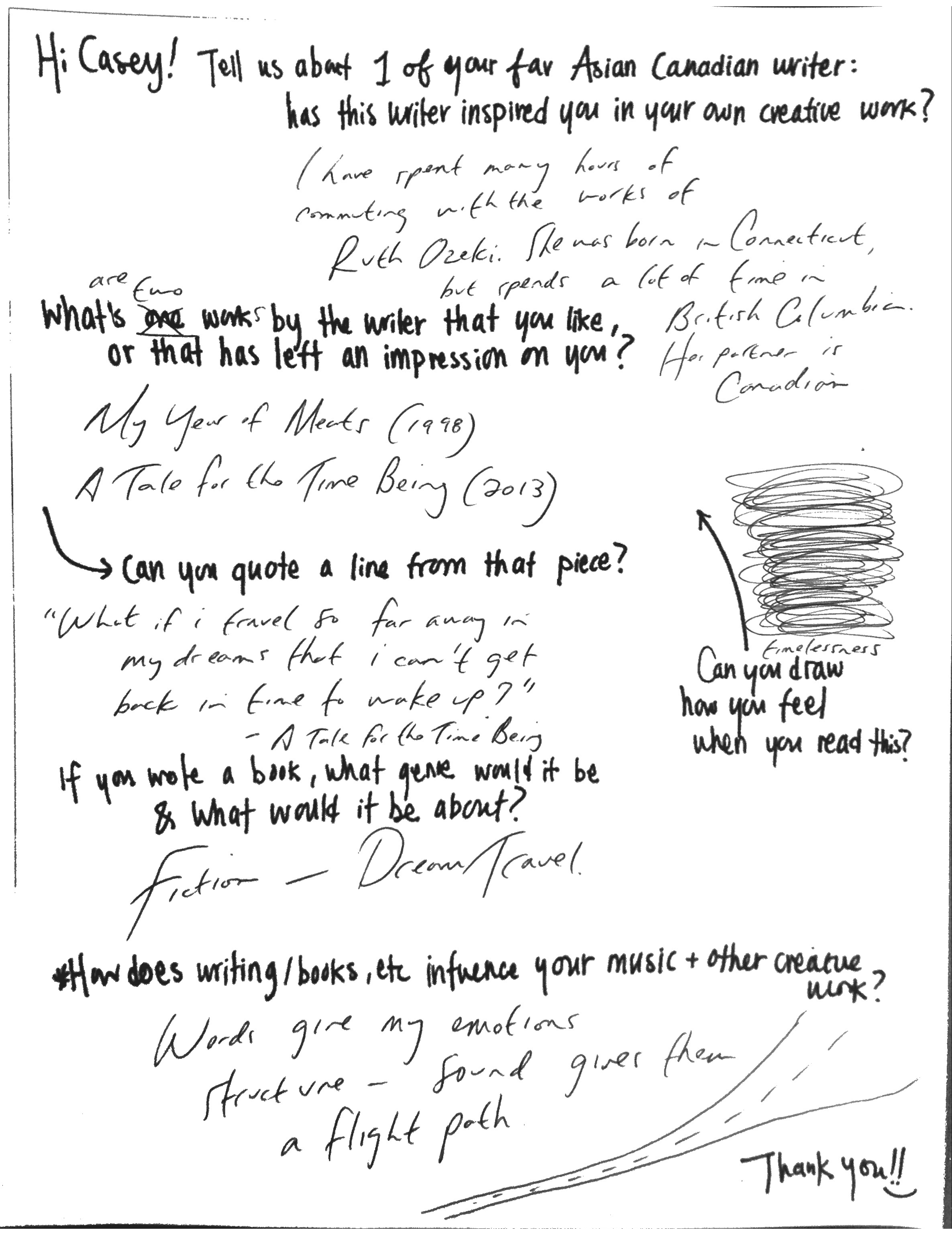 Ohbijou has played an important role in fostering my ongoing interest in Canadian indie folk music. My discovery of the band a few years ago opened my eyes to a music scene of which I was largely oblivious. Although I had listened to their songs before, it wasn’t until last year at a Reel Asian Film Festival event that I truly fell in love with their magic. The delicate voice ringing through the electro-pop sounds, echoing in the auditorium, convinced me that the energy and emotions of music can only be fully experienced in a live performance. I eventually found myself repeatedly playing Casey’s first solo album. When compiling a list of potential artists to feature in this series, it was a no-brainer that I had to get in touch with her. The lingering positive vibes from her recent concert still resonate, and I am thrilled to present Casey as the first creator for this series. Read about her creative journey and her “favourite” writer below.