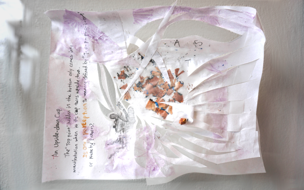 “Each documented response piece holds a thought process, from the green scribbles to the collaged pencil shavings; while each papercut adds another layer to the process, from sharp-edged triangles to rectangular cut-outs. Each photo holds a memory, from the tiny pieces of paper in the corner to the object filling the hollow gaps. And each art piece holds a unique story of migration and place-making – memories of our parents and caretakers, seeking and claiming haven, trying to figure out how to navigate this world.”